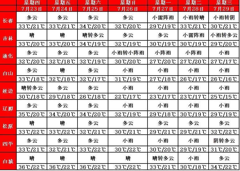 24日白天到夜间,延边东部多云,有阵雨或雷阵雨,其他地区晴有时多云。预计24日白天到夜间,全省大部分地区有3级左右偏东风。24日白天,白城地区最高气温为36度左右,其他大部分地区最高气温为32~33度;24日夜间, 我省东部地区最低气温为18度左右,其他地区19~23度。