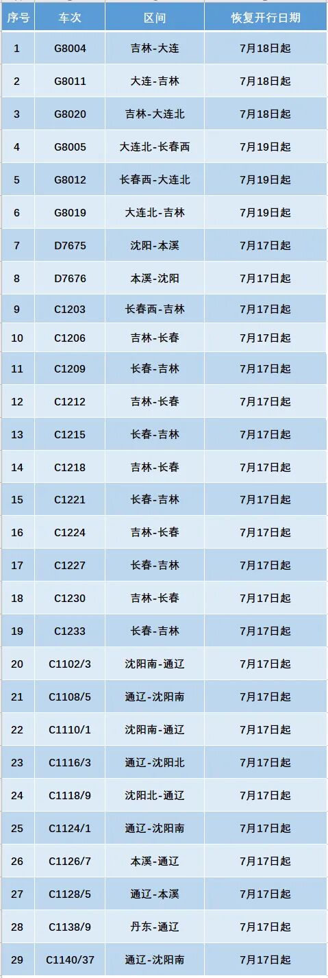 恢复开行列车 列车信息随时变化 沈阳铁路部门提醒广大旅客 相关列车运行信息以车站公告为准 请旅客密切关注12306铁路客服网站 及车站公告 了解最新列车运行动态 合理安排行程
